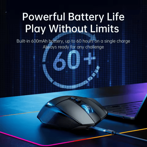 Với pin sạc 600mAh, chuột có thể hoạt động lên đến 60 giờ (không bật đèn) và 40 giờ (khi bật đèn RGB). Hệ thống đèn LED RGB 16.8 triệu màu với 7 chế độ hiệu ứng giúp setup của bạn thêm nổi bật. Hỗ trợ 7 nút lập trình và macro, TWG502 đáp ứng mọi nhu cầu từ chơi game đến làm việc chuyên nghiệp.