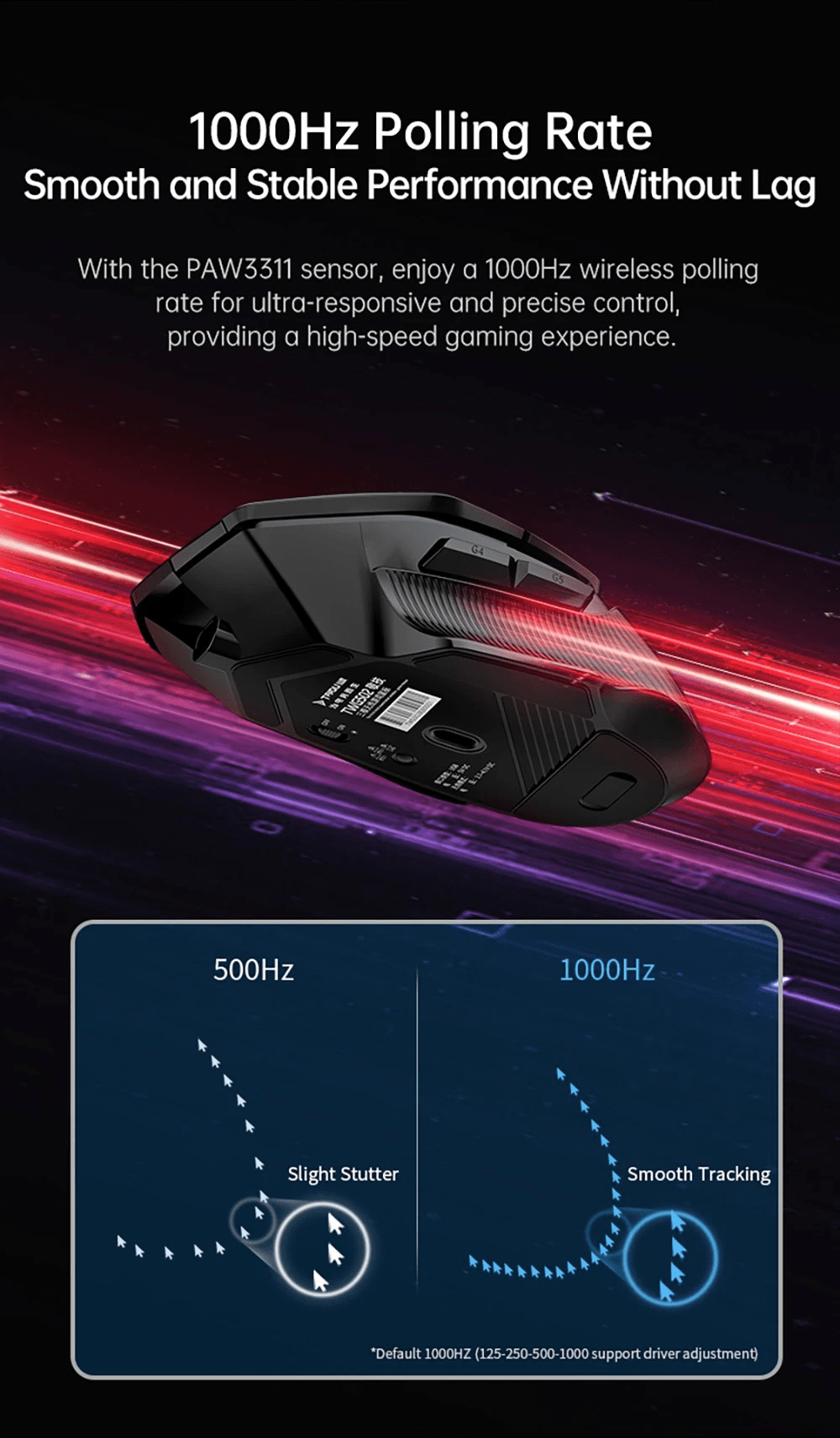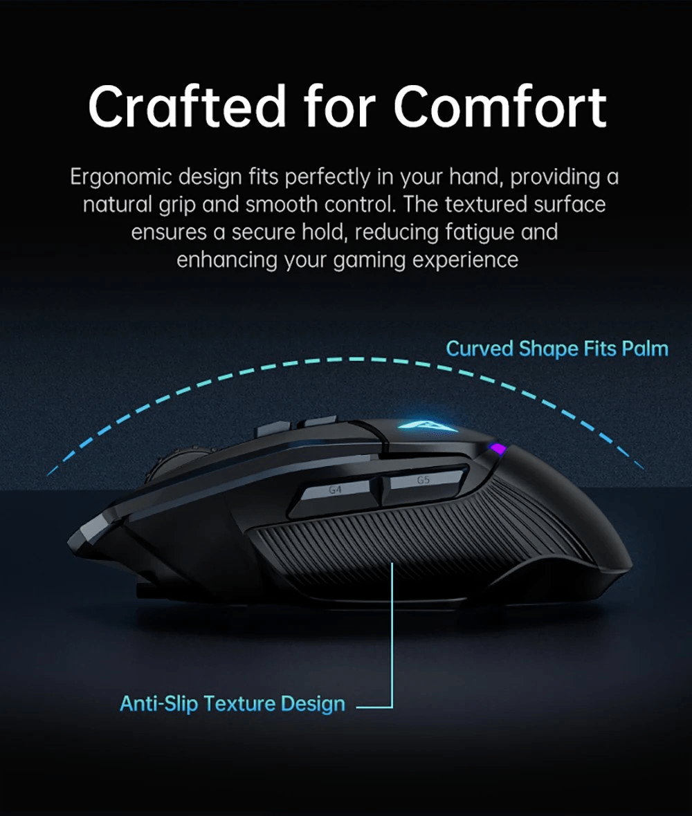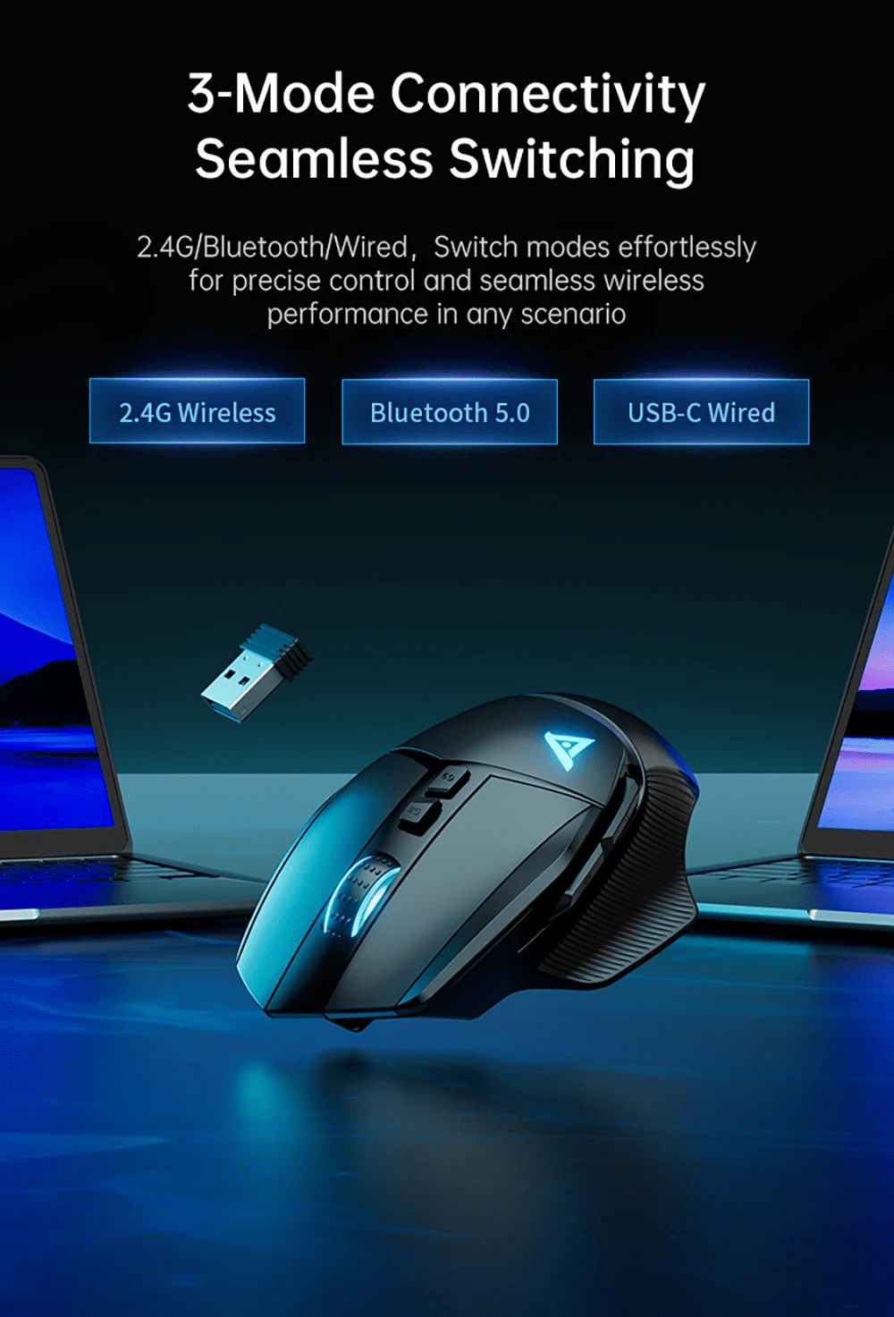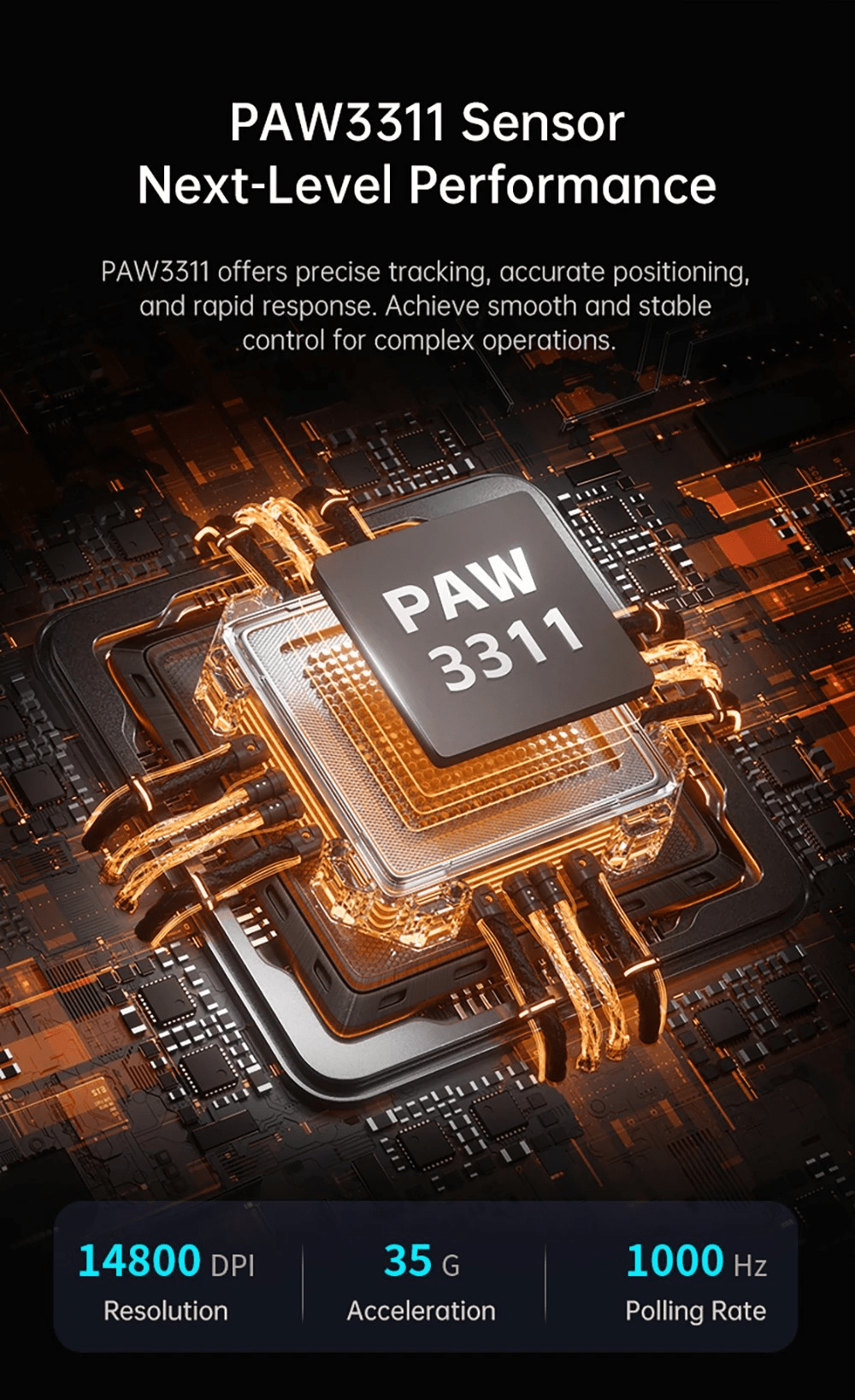 Chuột gaming Taidu TWG502 là lựa chọn lý tưởng cho game thủ và dân văn phòng nhờ thiết kế công thái học thoải mái, trọng lượng siêu nhẹ chỉ 72g và khả năng kết nối 3 chế độ: 2.4G Wireless, Bluetooth 5.0 và USB-C có dây. Trang bị cảm biến PAW3311 cao cấp cùng độ phân giải lên đến DPI 14800, TWG502 mang đến độ chính xác tuyệt vời trong từng thao tác.