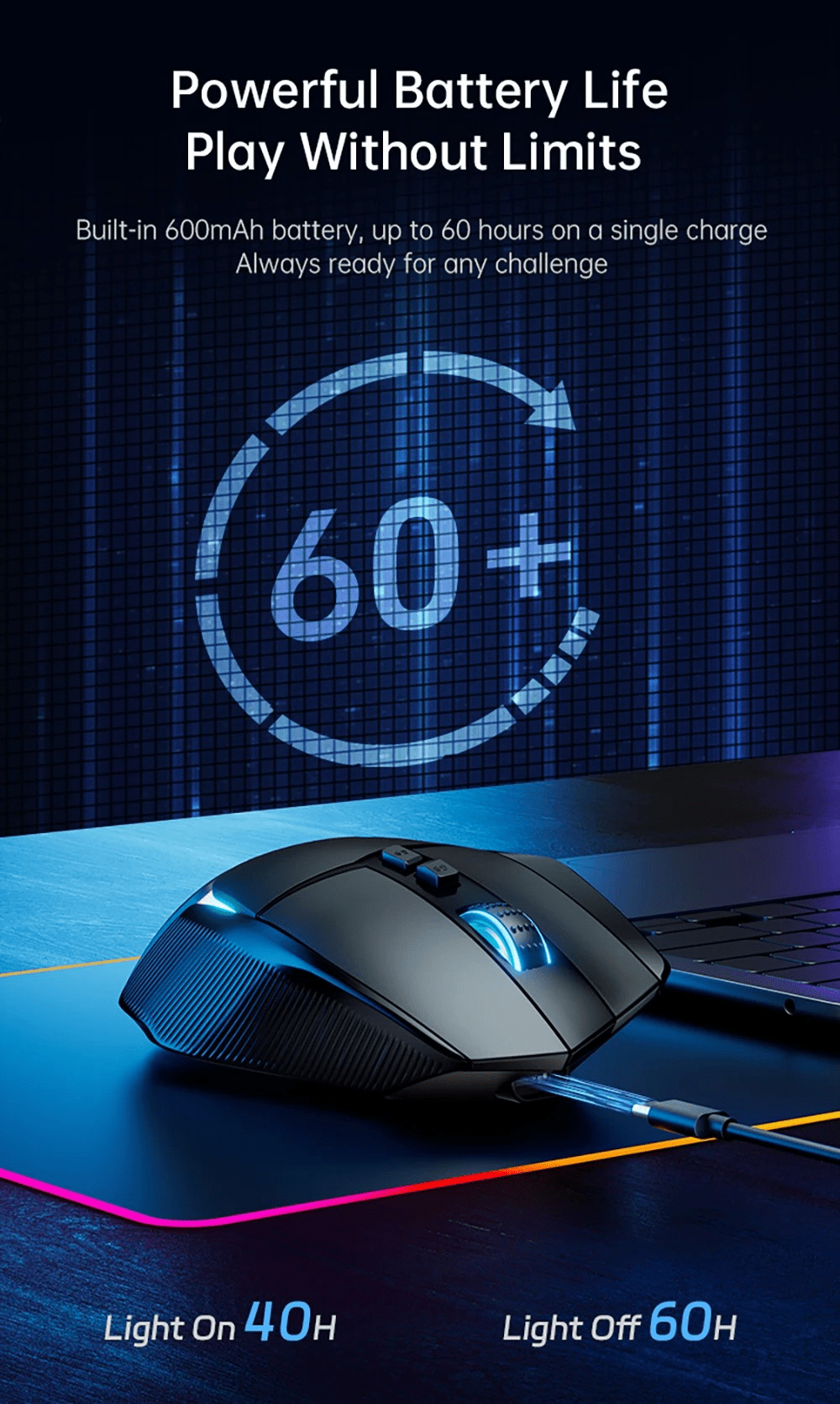 Với pin sạc 600mAh, chuột có thể hoạt động lên đến 60 giờ (không bật đèn) và 40 giờ (khi bật đèn RGB). Hệ thống đèn LED RGB 16.8 triệu màu với 7 chế độ hiệu ứng giúp setup của bạn thêm nổi bật. Hỗ trợ 7 nút lập trình và macro, TWG502 đáp ứng mọi nhu cầu từ chơi game đến làm việc chuyên nghiệp.
